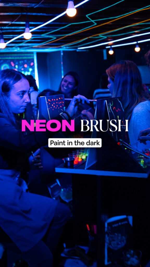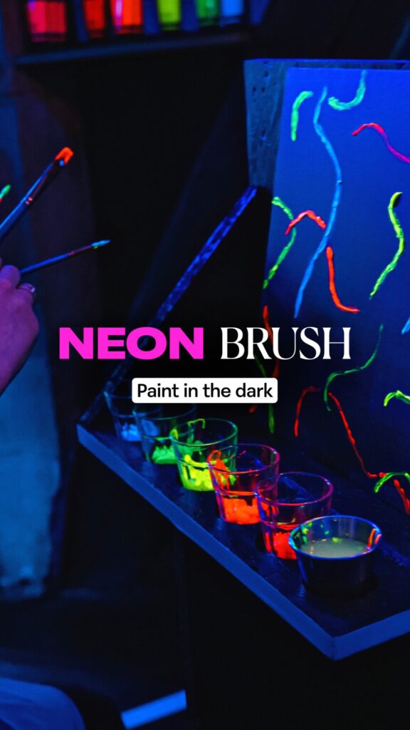 Deux expériences, une explosion de couleurs ! Que vous soyez adulte en quête d’une soirée originale ou parent à la recherche d’une activité familiale inédite, Neon Brush vous promet un moment créatif inoubliable.